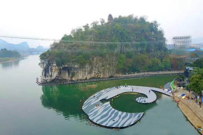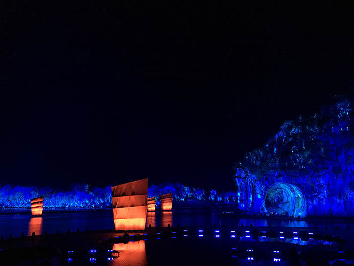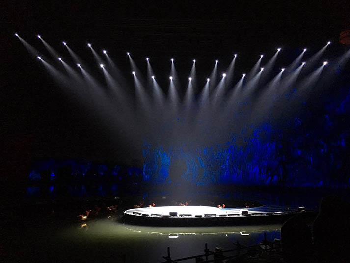 桂林象鼻山是今年央視春晚分會(huì)場(chǎng)之一,在舞臺(tái)搭建方面,以象鼻山作為整個(gè)舞臺(tái)的天然背景,突出象鼻山這一桂林山水文化元素,打造有“象山水月”寓意的舞臺(tái)效果。以山與水結(jié)合作為演出舞臺(tái),舞臺(tái)燈具沒(méi)有辦法在水面上或者半空中搭建桁架,為此次戶(hù)外實(shí)景演出增加極大的難度。