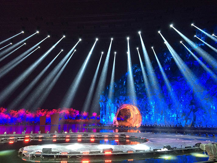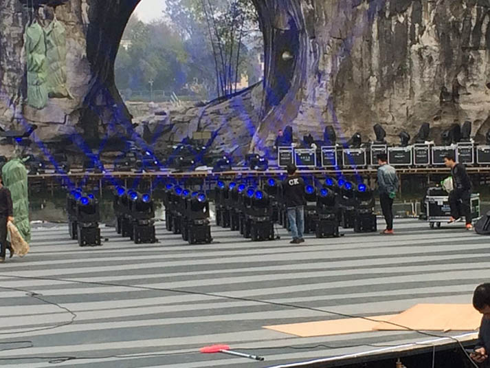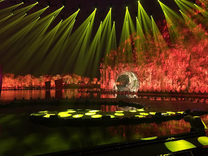浩洋電子采用內(nèi)置Philip全球首發(fā)鉑金21R光源的全新三合一電腦燈G21HYBRID,結(jié)合浩洋創(chuàng)新研發(fā)全新移動(dòng)電源挑戰(zhàn)此次高難度的舞臺(tái)燈光設(shè)計(jì),突破在水上搭建舞臺(tái)的重重困難,讓燈具首次高掛在半空,成功實(shí)現(xiàn)世界首創(chuàng)驚艷電腦燈飛行演出!為桂林分會(huì)場(chǎng)的舞臺(tái)燈光設(shè)計(jì)增添一大閃耀的關(guān)注點(diǎn)。而身處岸邊的染色燈City400擔(dān)任裝點(diǎn)象鼻山的重責(zé),將水中心的象鼻山裝點(diǎn)成一片綠意盎然的畫(huà)面。