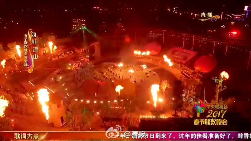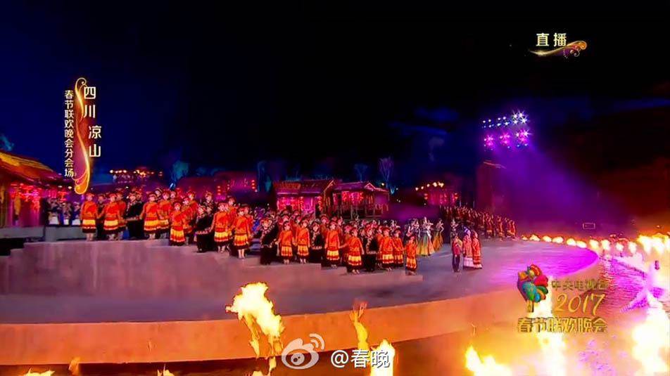 西昌作為央視春晚在西部的唯一一個(gè)分會(huì)場(chǎng),主舞臺(tái)主要依托大型實(shí)景演出《阿惹妞》的表演場(chǎng)地,不僅再現(xiàn)涼山彝族早期的原生態(tài)生活場(chǎng)景,營(yíng)造彝人的生活氣息,而且巧妙運(yùn)用火元素,高科技的舞臺(tái)機(jī)械和水火特效相結(jié)合,呈現(xiàn)震撼的視覺(jué)效果。另外,在規(guī)模宏大的圓形廣場(chǎng)上聳天挺立,有56根紅色火炬形巨柱,各刻圖騰,象征全國(guó)56個(gè)民族的大團(tuán)結(jié)。