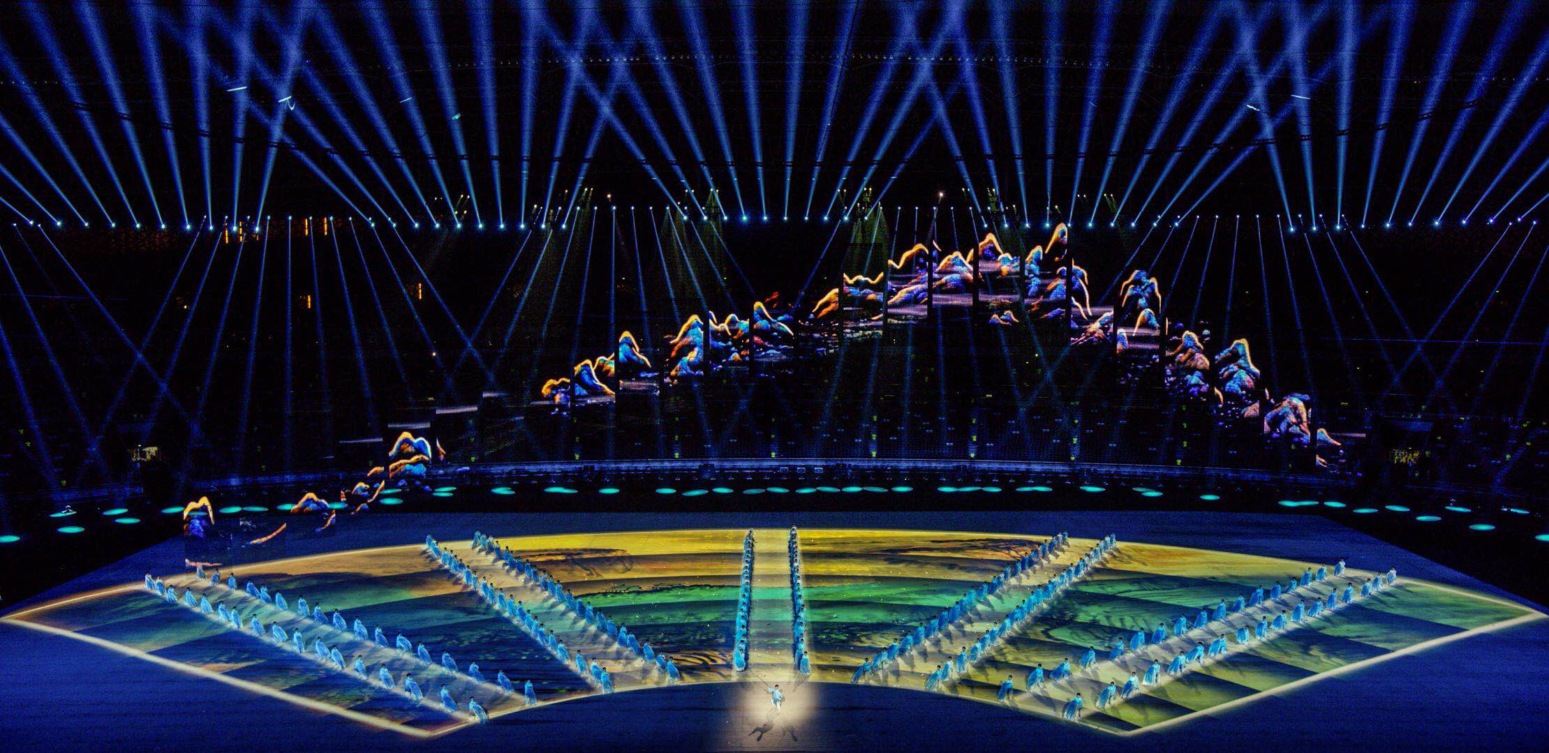 運(yùn)動(dòng)會(huì)開(kāi)幕式的舞美設(shè)計(jì)以呈現(xiàn)山西特色為重點(diǎn),以寫(xiě)意的方式展現(xiàn)山西人文魅力和精神風(fēng)貌。借助威亞系統(tǒng),25塊彩幕隨著演出內(nèi)容在空中變換造型,與地面全景投影相得益彰,打造一場(chǎng)歷史積淀與科技創(chuàng)新交織融合,人文魅力與時(shí)代精神交相輝映的開(kāi)幕式表演。