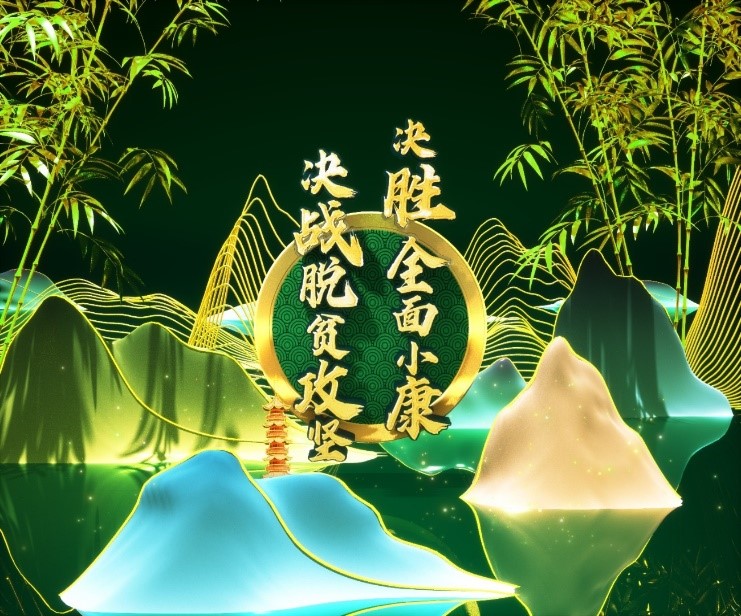 該篇章以綠色為主色調(diào),青山流水為景,畫面由畫筆描繪錦鯉,翠竹傍山,盡顯中國(guó)一片綠水青山的大好景致。以此畫面帶出2020年我國(guó)將全面建成小康社會(huì),實(shí)現(xiàn)第一個(gè)百年奮斗目標(biāo)的堅(jiān)定決心。