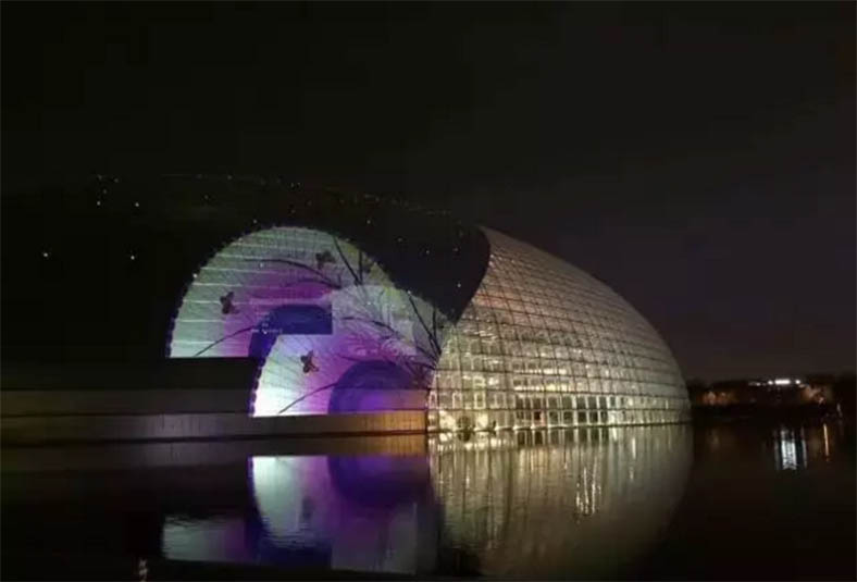 晚會當(dāng)晚,國家大劇院殼體、水面,及周邊建筑被集體打亮,其場面宏大、氣勢非凡。國家大劇院在三種顏色的基礎(chǔ)上,增加至8種燈光顏色循環(huán)變換,北門處增加了“花?!睙艄庋b飾效果,呈現(xiàn)燈光璀璨的壯觀場面。