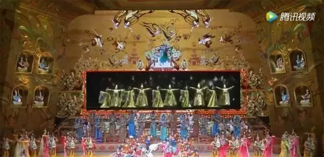 文藝晚會有效運用科技元素,使晚會的舞美設(shè)計帶有顯著特色。晚會多項節(jié)目散發(fā)舞美空間魅力,設(shè)計師巧妙地把節(jié)目的內(nèi)在意境外化,觀眾也能隨著舞美空間馳騁在想象的旅程中。另外,《千年之約》等節(jié)目中,應(yīng)用了全息投影技術(shù),這也是杭州G20全息技術(shù)的升華應(yīng)用,使壁畫中的人物栩栩如生,實現(xiàn)真實的演員和全息影像交替出現(xiàn),與舞臺燈光完美結(jié)合,形成3D全息效果,達到似真似幻的效果。