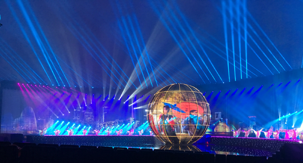 ? ? ? 特別在本次燈光焰火演出中,浩洋電子的飛燈系統依然成為了一大亮點,與眾不同的是,浩洋飛燈系統打破了“燈位不動,只有光在運動”的限制,讓電腦燈本身也運動起來,自由翱翔,實現從“光的運動”到“運動的光”著巨大的轉變。浩洋飛燈系統的研發(fā)是與2016年9月杭州G20峰會文藝演出《最憶是杭州》息息相關,當時的總制作人著名燈光設計沙曉嵐提出“舞蹈演員吊掛著威亞,從外湖飛入西湖演出舞臺”的設想,與合作方浩洋電子進行了大量的研發(fā)試驗,但由于西湖的地理位置限制,這個創(chuàng)意未能實現,研發(fā)的成果也保留了下來,最終在2017年的央視春晚桂林分會場實現了浩洋飛燈系統的全球首秀。在本次上海合作組織青島峰會燈光焰火藝術表演中,浩洋飛燈系統以創(chuàng)新科技化燈光震撼獻力國家重要演出活動,勾勒出一幅科技燈光與文化相融合的視覺美景。