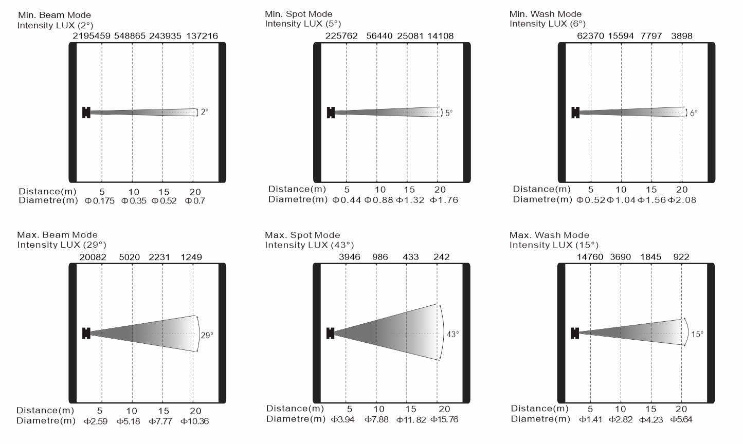 變焦范圍:光束模式: 2°-29°,圖案模式: 5°-43°,染色模式:6°-15°