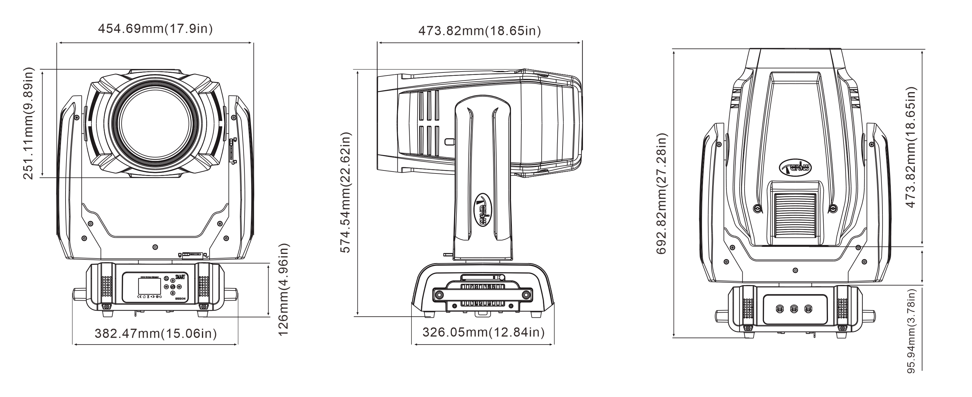 變焦范圍:光束模式: 2°-29°, 圖案模式: 3°-38.5°, 染色模式: 18.5 -35.5°